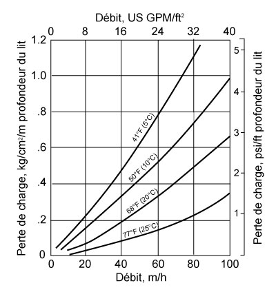 Fig. 3 montre la perte de pression prévue par pied de profondeur du lit en fonction du débit à différentes températures.
