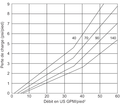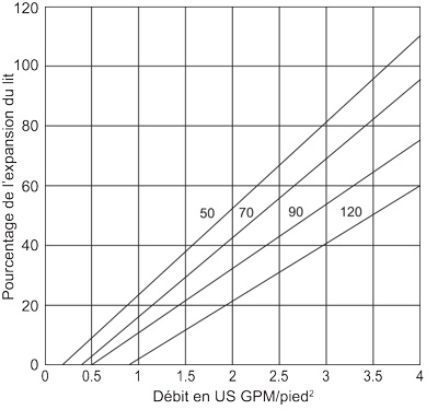 Le graphique ci-dessous montre la perte de charge prévue par pied de profondeur de lit en fonction du débit à différentes températures.